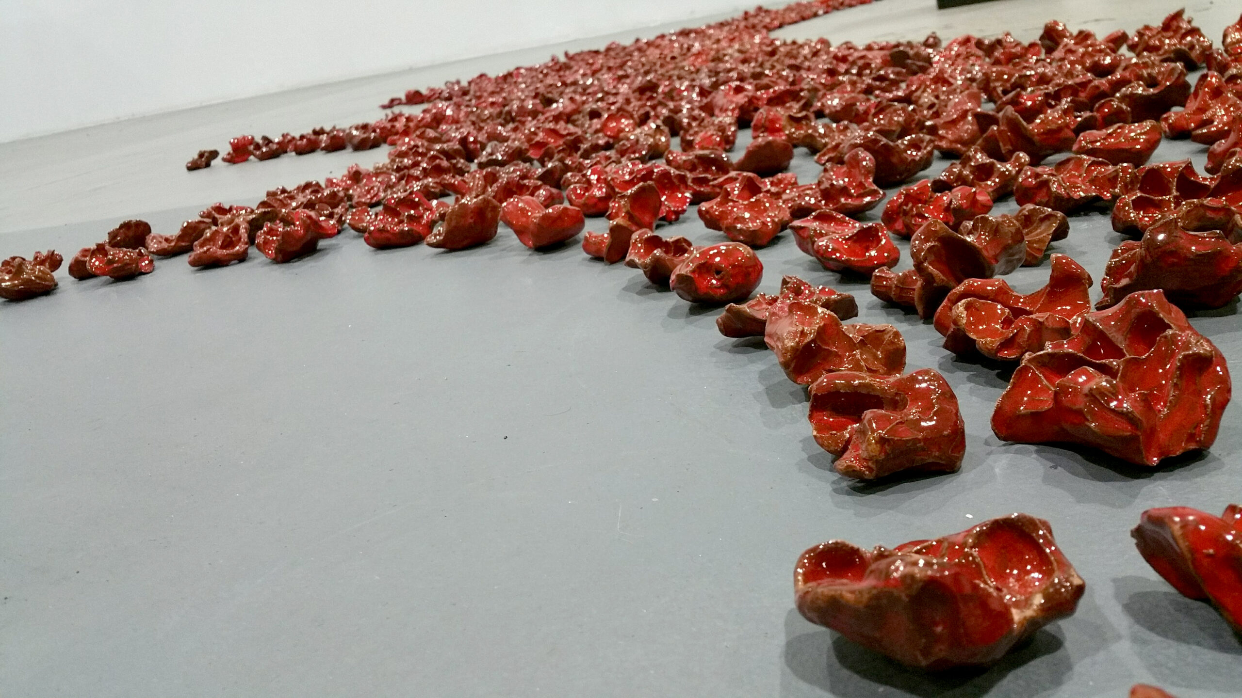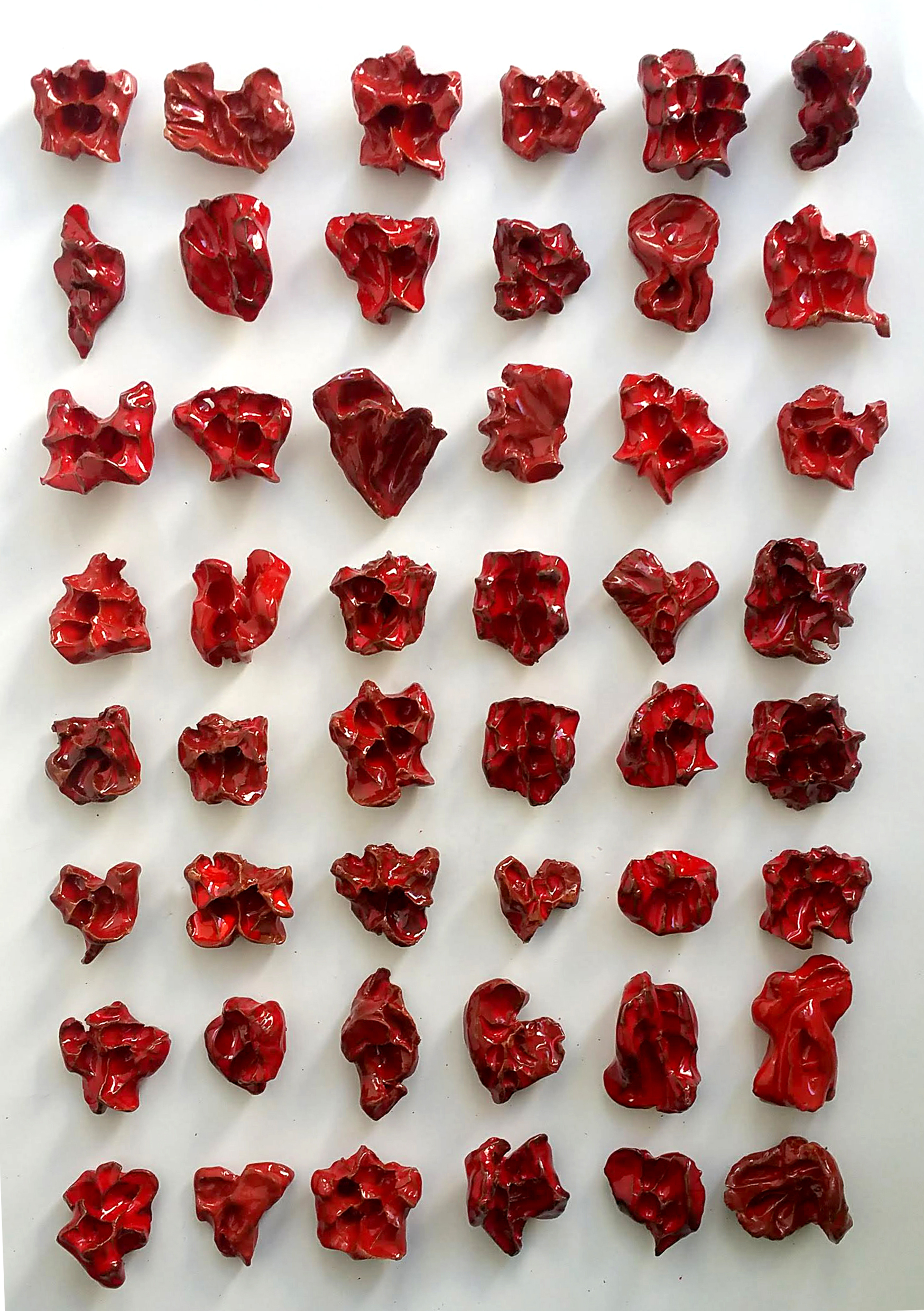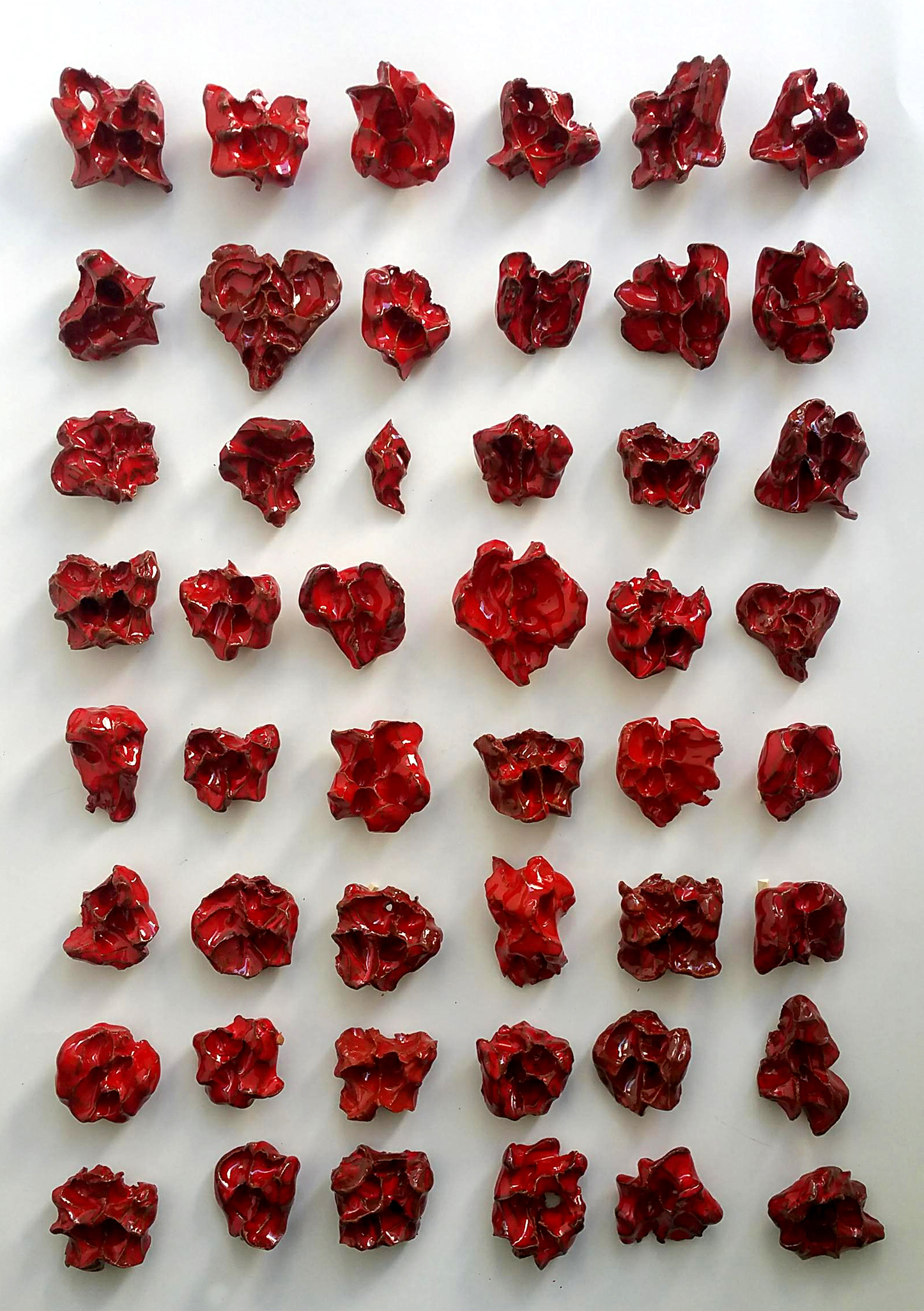 The work comprises approximately 1,600 handmade, unique glazed red clay ceramic elements, each measuring around 8 × 8 × 4 cm (with slight variations). Each piece fits in the palm of a hand. The elements are distributed to the public in sets of five. Together, they form a conceptual “yield,” referencing fruits associated with the cycle of life, particularly the pomegranate.