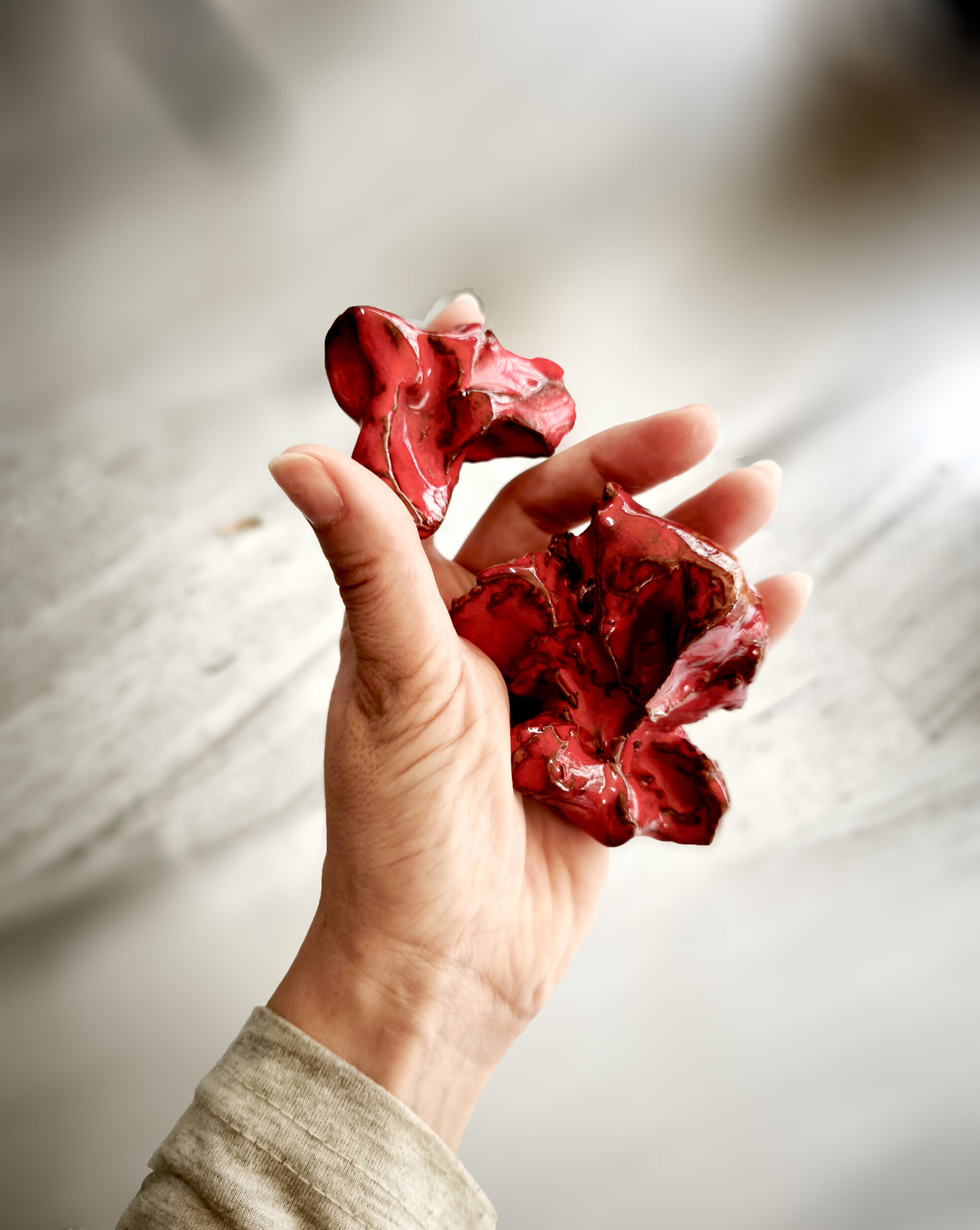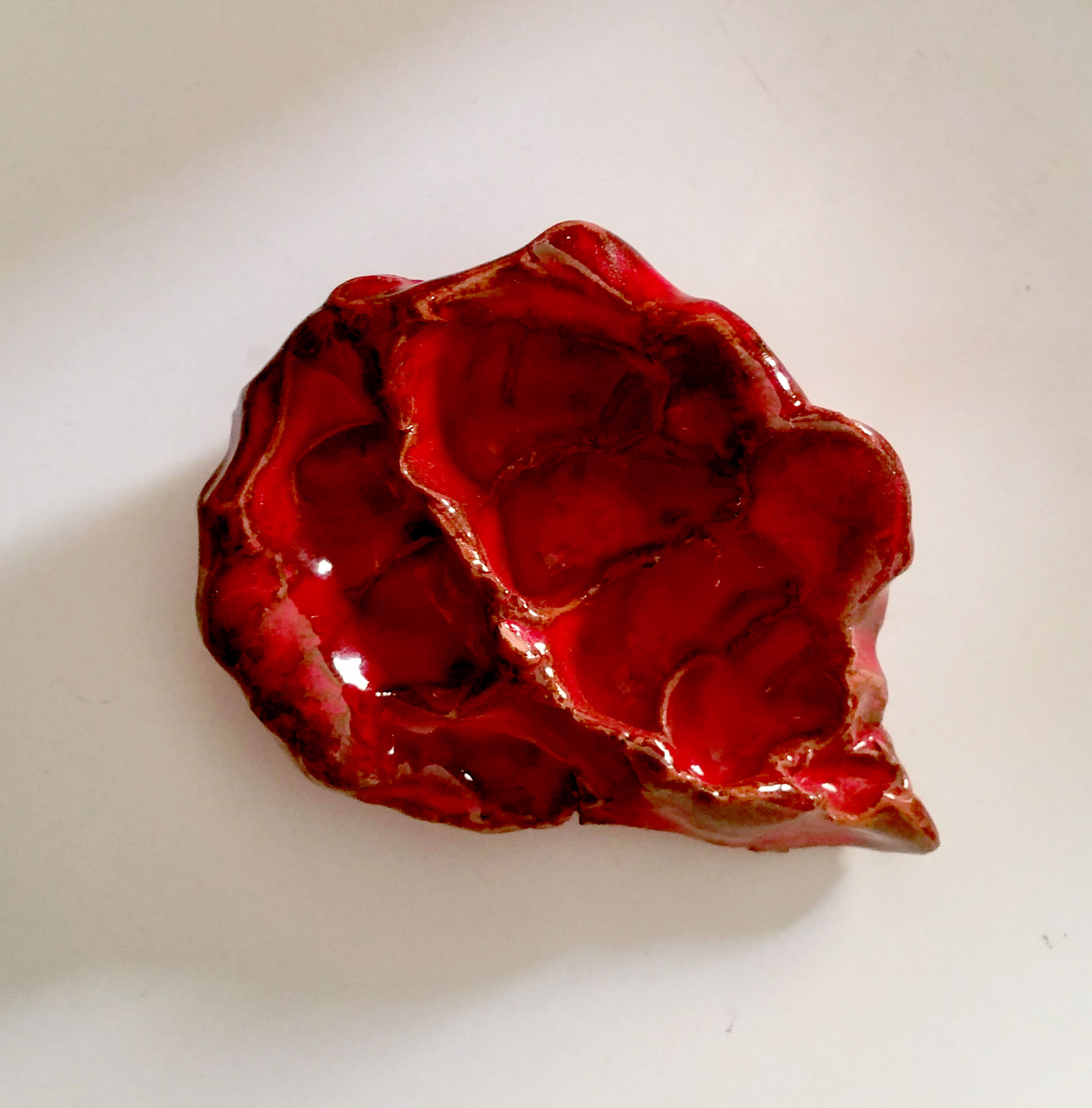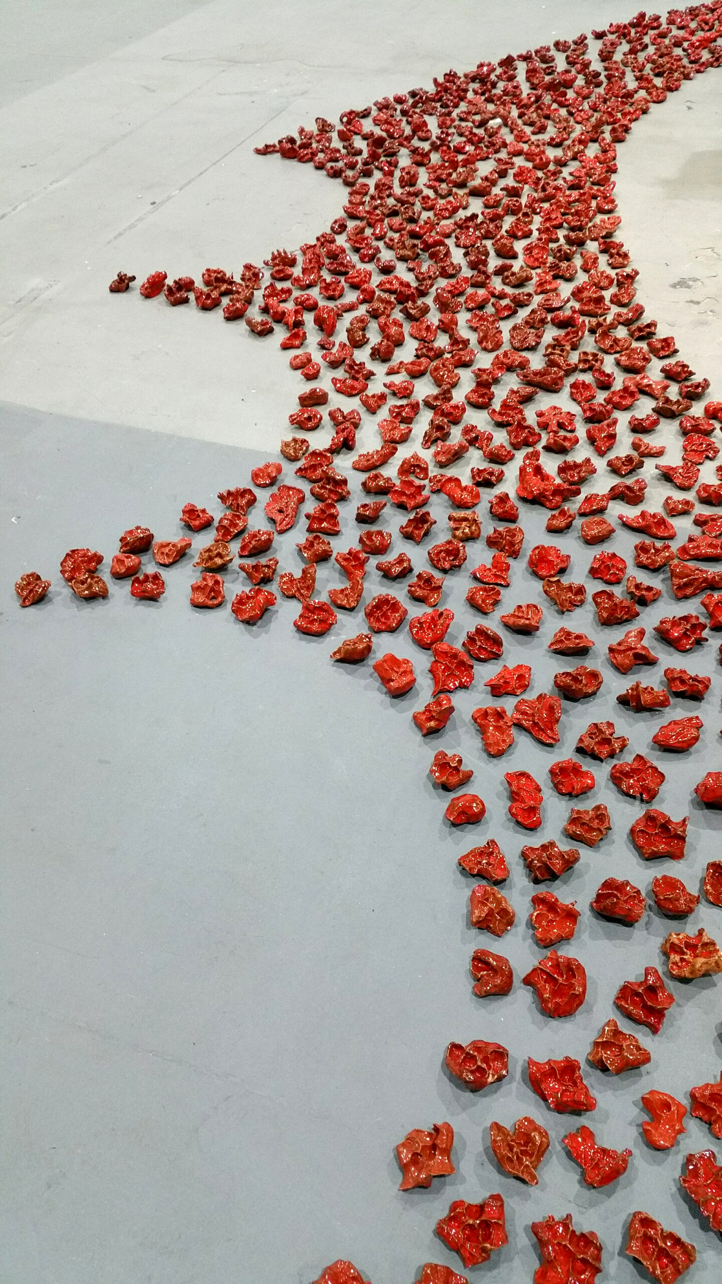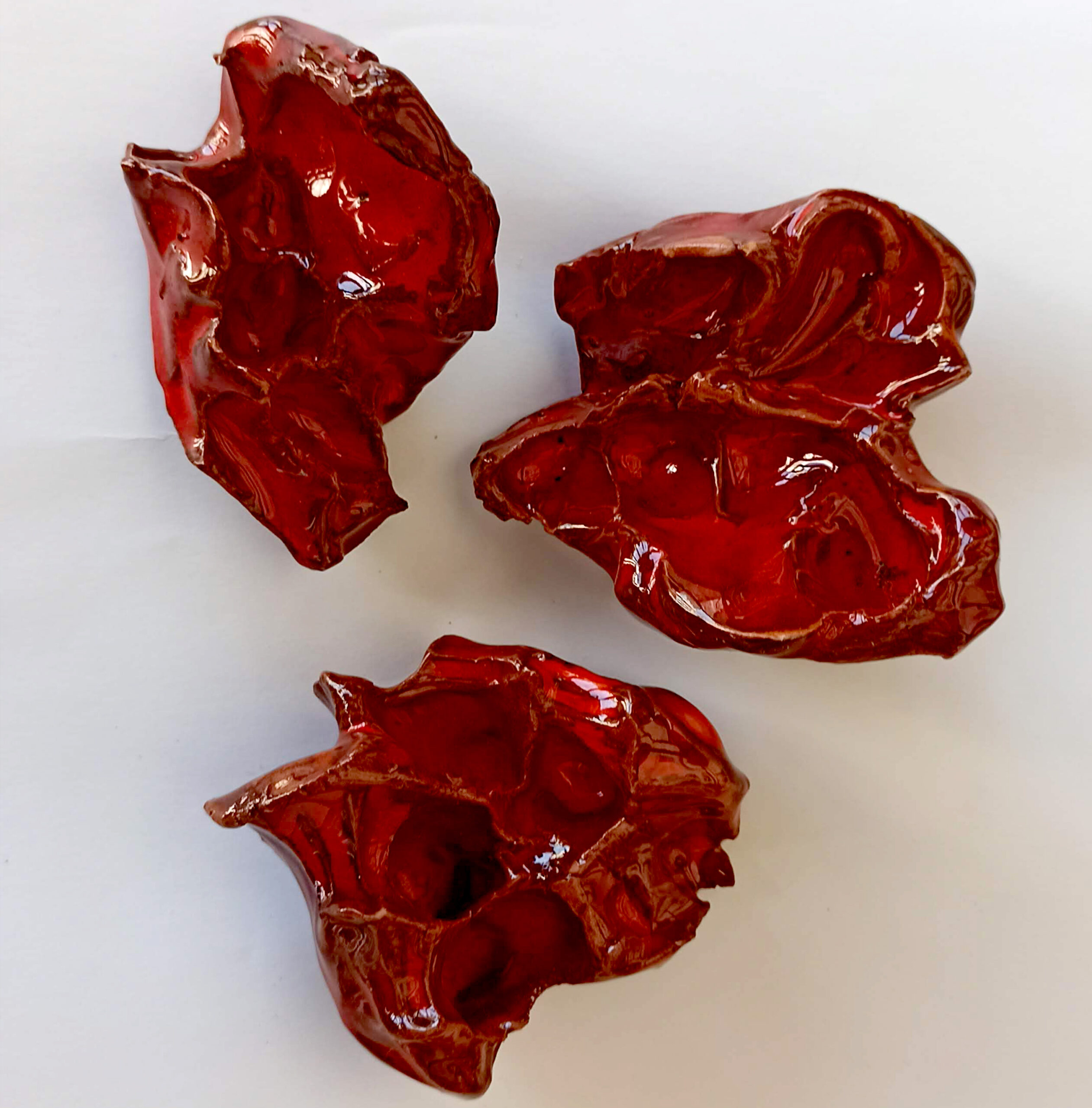 The work comprises approximately 1,600 handmade, unique glazed red clay ceramic elements, each measuring around 8 × 8 × 4 cm (with slight variations). Each piece fits in the palm of a hand. The elements are distributed to the public in sets of five. Together, they form a conceptual “yield,” referencing fruits associated with the cycle of life, particularly the pomegranate.